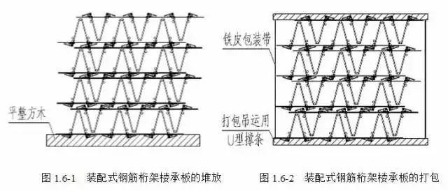 1、鋼筋桁架樓承板應(yīng)遵循相同規(guī)格同垛堆放的原則。堆放時(shí)兩塊板正反倒扣為一組,堆放在平整方木上,如圖1.6-1所示。